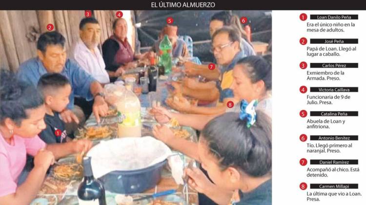 Últimos datos. El jueves 13 de junio a las 14.20 Daniel Ramírez, Carmen Millapi, Bernardino Benítez, su esposa Laudelina Peña, y una mujer de nombre Camila, también familiar del nene desaparecido, salieron de la casa de Catalina, rumbo a un naranjal. Lo hicieron junto a Loan y otros cinco niños de entre 5 y 10 años.