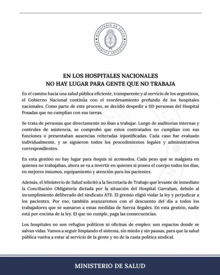Desde la cartera sanitaria explicaron que los despidos se resolvieron tras realizar auditorías internas y controles de asistencia. “Se trata de personas que directamente no iban a trabajar”, señalaron en un mensaje difundido en redes sociales. También indicaron que se revisó cada caso de manera individual y que se siguieron los procedimientos legales y administrativos correspondientes.