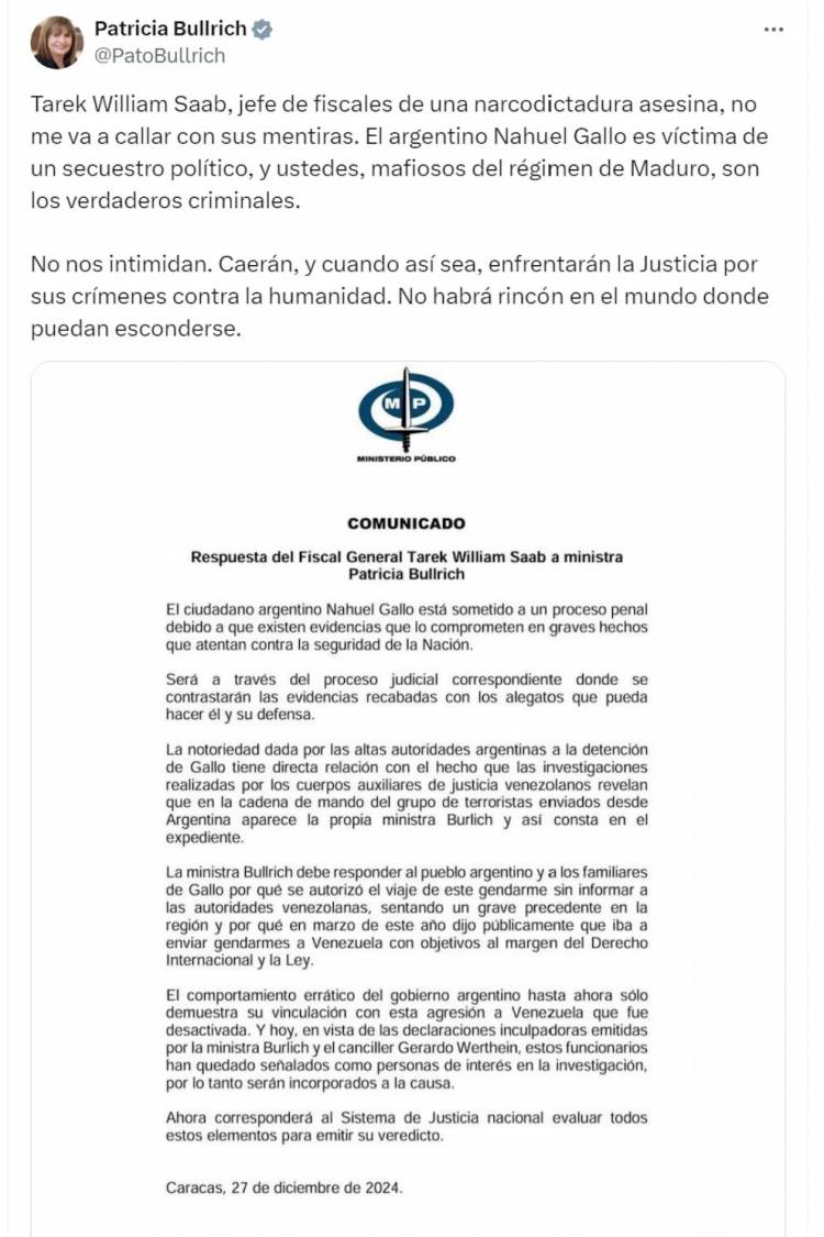 “Tarek William Saab, jefe de fiscales de una narcodictadura asesina, no me va a callar con sus mentiras. El argentino Nahuel Gallo es víctima de un secuestro político, y ustedes, mafiosos del régimen de Maduro, son los verdaderos criminales. No nos intimidan. Caerán, y cuando así sea, enfrentarán la Justicia por sus crímenes contra la humanidad. No habrá rincón en el mundo donde puedan esconderse”, respondió Bullrich en sus redes sociales.