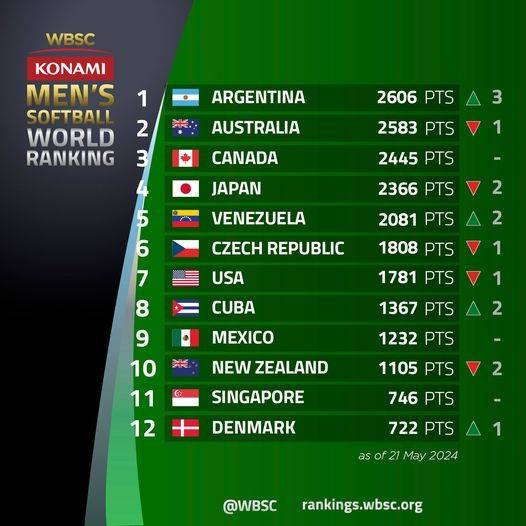 El seleccionado nacional mayor de softbol masculino alcanzó el puesto más alto en el Ranking WBSC/KONAMI tras conseguir el tercer lugar en la Copa Mundial Sub-23 disputada en Paraná. Argentina supera en el ranking a los seleccionados de Australia, Canadá y Japón, y recupera la cima después de seis meses con un acumulado total de 2.606 puntos.