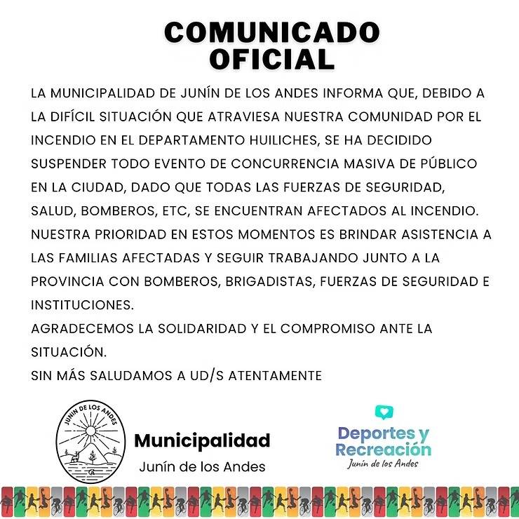La reprogramación de la fiesta del Puestero dio un indicio que las diferentes localidad cordilleranas de Neuquén y Rio Negro están viviendo un difícil momento, y en las últimas horas, el municipio de Junín de los Andes emitió un comunicado donde suspende todo tipo de evento de convocatoria masiva, tanto cultural como deportivo, dado que todas las fuerzas de seguridad, salud, y bomberos, se encuentran afectados en el combate contra los incendios.