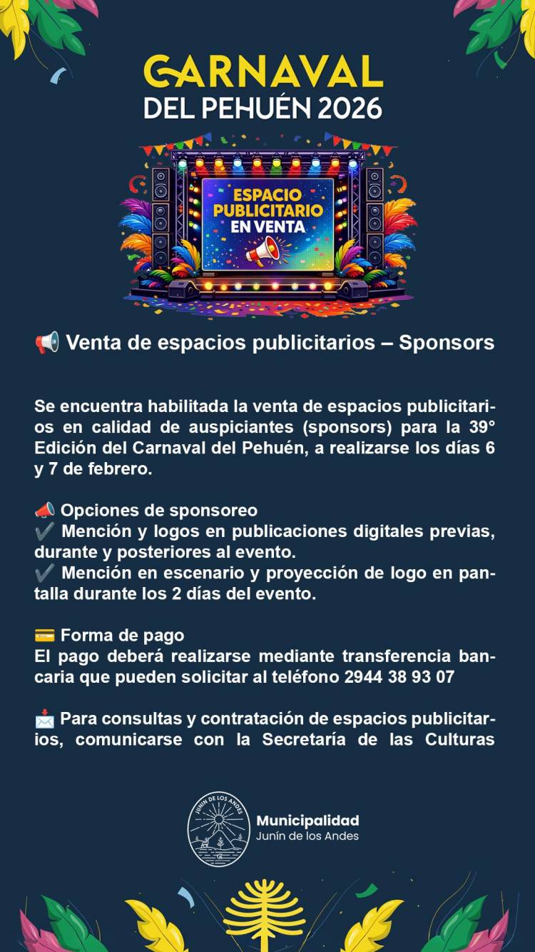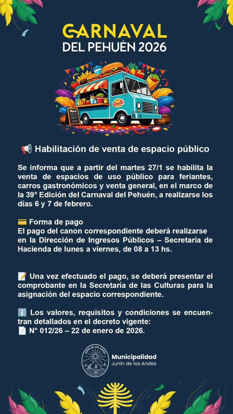 Se informa que a partir del martes 27/1 se encuentra habilitada la venta de espacios de uso público (feriantes, carros gastronómicos y venta general) y la venta de espacios publicitarios para sponsors, en el marco de la 39° Edición del Carnaval del Pehuén, que se realizará los días 6 y 7 de febrero.
