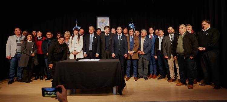 En la previa del desfile por el 9 de Julio, el gobernador celebró dos convenios de cooperación y financiamientos destinados a fortalecer los sistemas de riego y de drenajes con intendentes y presidentes de comisiones de fomento. Tras las firmas todos compartieron el palco para seguir el desfile.