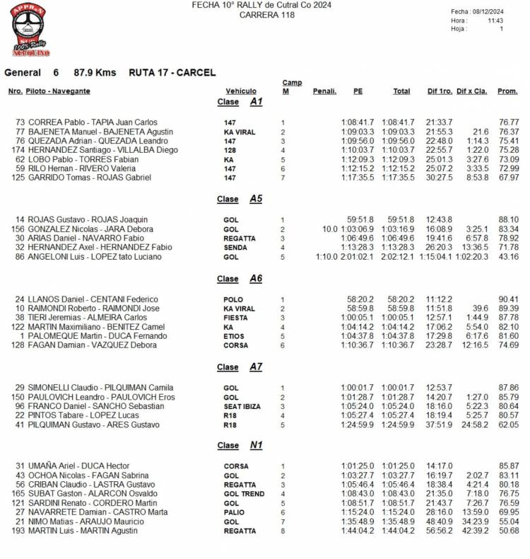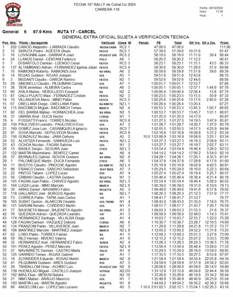 La carrera de Cutral Có tuvo en muy buen nivel a Juan Lovagnini, que en su segunda prueba con el Peugeot 208 terminó segundo en la RC5. Di Bartolo llegó tercero y Adrián Altamirano (que dos fechas atrás protagonizó un terrible vuelco), finalizó cuarto en la última carrera del año.