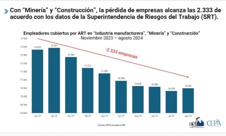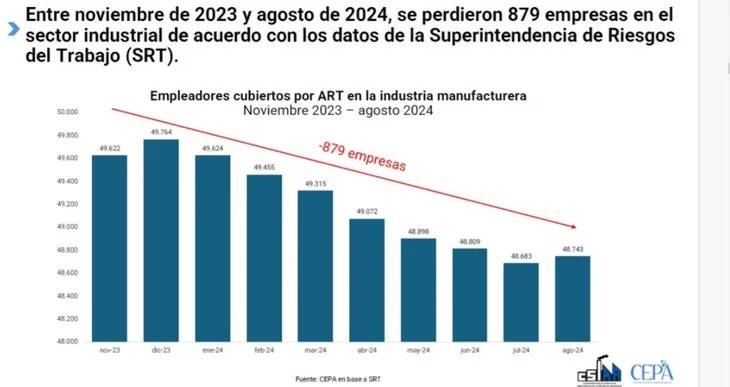Entre noviembre de 2023 y agosto de 2024, se perdieron 38.532 puestos de trabajo en el sector industrial. Y, si se incluye a la minería y la construcción, la pérdida asciende a 126.050, de acuerdo con los datos de la Superintendencia de Riesgos del Trabajo (SRT). A su vez, desaparecieron 879 empresas en la industria manufacturera. El 92% de las entidades sindicales declaró que el uso de la capacidad instalada se mantiene igualo desmejoró desde el inicio del mandato de Milei.