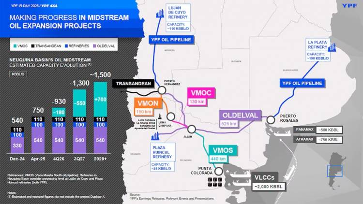 El oleoducto podrá transportar hasta 550.000 barriles de petróleo por día desde el segundo semestre de 2027, con capacidad de expansión a 700.000 barriles diarios, lo que lo convierte en una pieza clave para el crecimiento sostenido de la producción y exportaciones de Vaca Muerta, considerada la cuarta reserva de shale oil del mundo.
