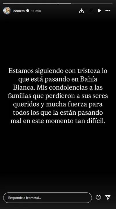 “Estamos siguiendo con tristeza lo que está pasando en Bahía Blanca. Mis condolencias a las familias que perdieron a sus seres queridos y mucha fuerza para todos los que la están pasando mal en este momento tan difícil”, escribió el astro rosarino.