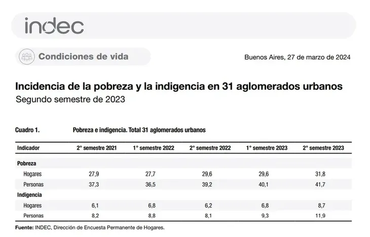 La pobreza escaló al 41,7% de la población argentina en el segundo semestre de 2023, desde el 40,1% registrado en el semestre previo, anunció este miércoles el Instituto Nacional de Estadística y Censos (INDEC). De esta forma, unos 19,5 millones de argentinos son pobres, teniendo en cuenta la radiografía social de ese momento. A esa situacion, hay que sumarle que según el observatorio Social de la UCA el nivel de pobreza llegará a alrededor del 60% entre febrero y marzo de 2024.