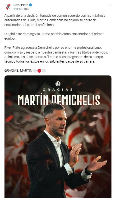 River Plate agradece a Demichelis por su enorme profesionalismo, compromiso y respeto a nuestra camiseta, y los tres títulos obtenidos. Asimismo, les desea tanto a él como a los integrantes de su cuerpo técnico todos los éxitos en los siguientes pasos de su carrera.